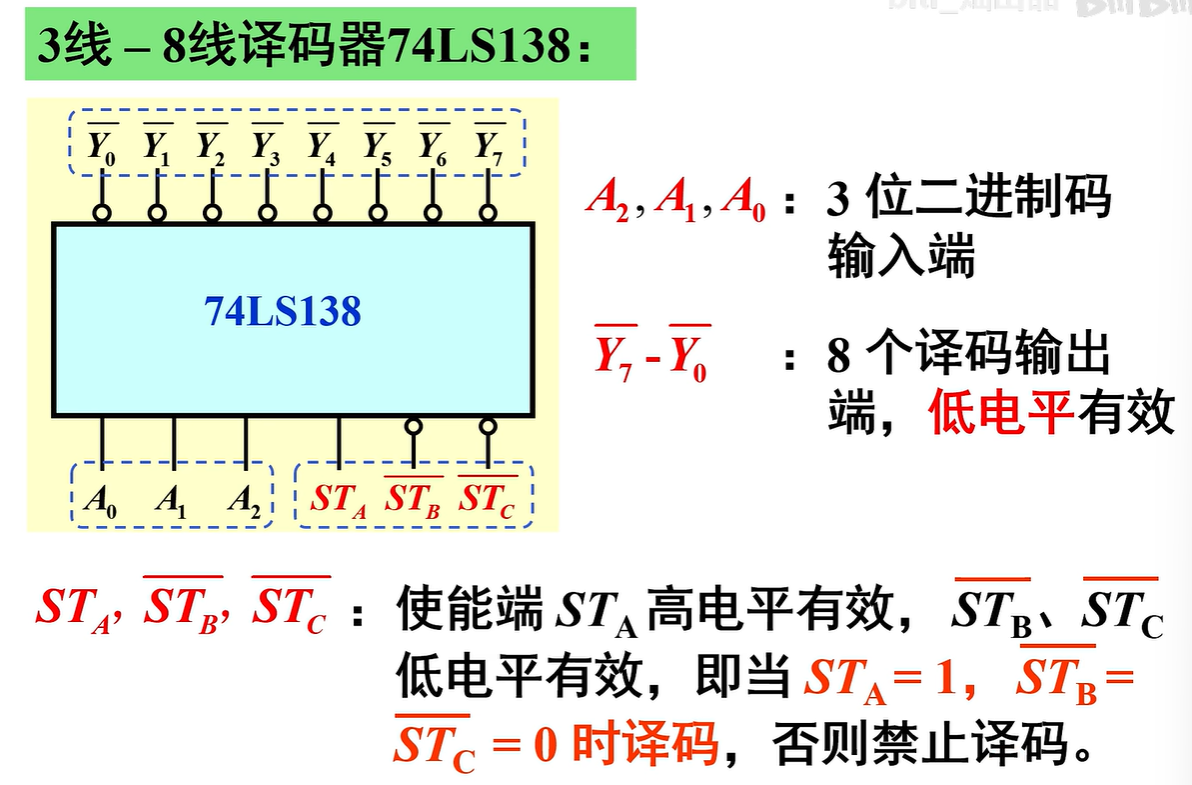 用 3 线 - 8 线译码器74LS138可以构成 1 路 - 8 路数据分配器。\(A_2\)、\(A_1\)、\(A_0\)为地址信号输入端,\(\bar Y_0\)~\(\bar Y_7\)为数据输出端,三个使能\(\bar {ST_A}\)、\(\bar {ST_B}\)、\(ST_C\)中的任一个都可作为数据D输入端