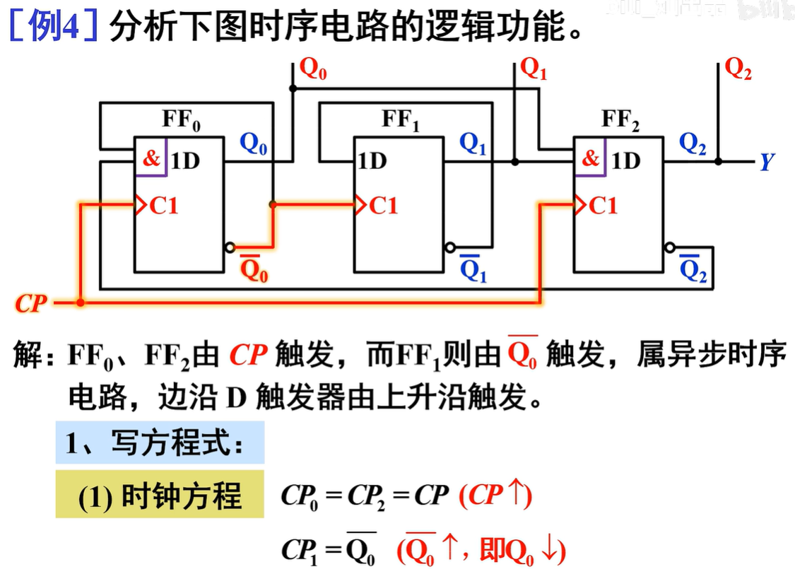 \(FF_0\)由CP触发,而\(FF_1\)、\(FF_2\)则由\(Q_0\)触发,故为异步时序电路